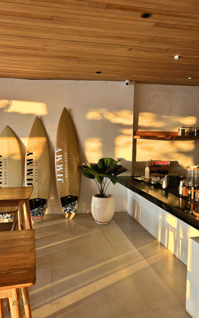 I loved their iced matcha, and the staff was so kind — they even let me stay for a couple of hours to get some work done while soaking in the atmosphere: the warm-toned café, the sunset, and the beach just below.