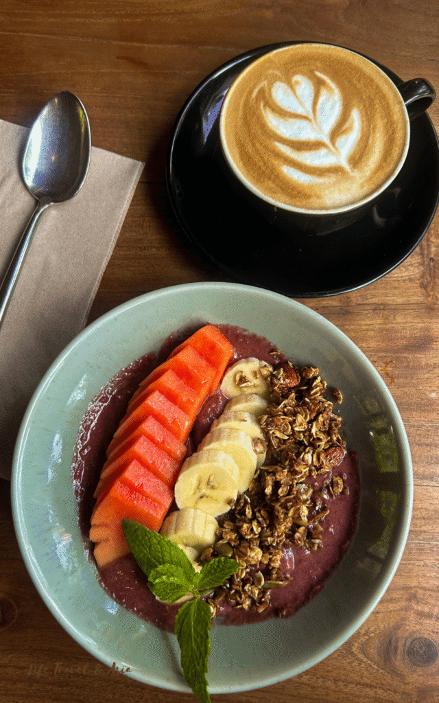 I didn’t stop for lunch here, but I did have a super creamy latte and a bowl of tropical fruit with homemade ice cream, which I absolutely loved.