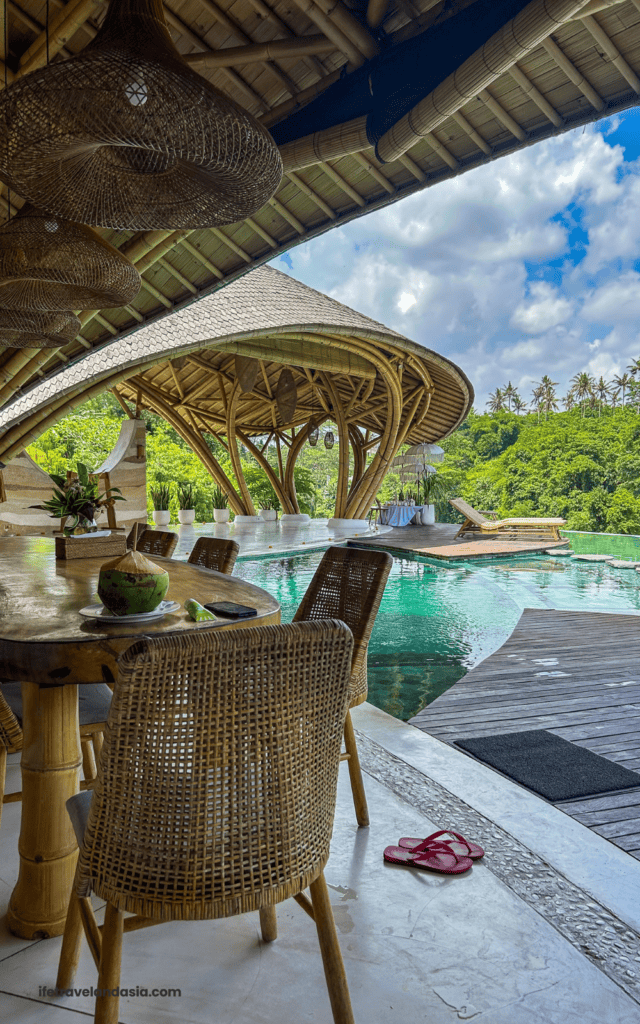 What impressed me the most upon arrival was the beautiful harmony of natural colors: the warm bamboo of the main structure and bungalows, the deep green of the surrounding jungle, and the soft light blue of the swimming pool.