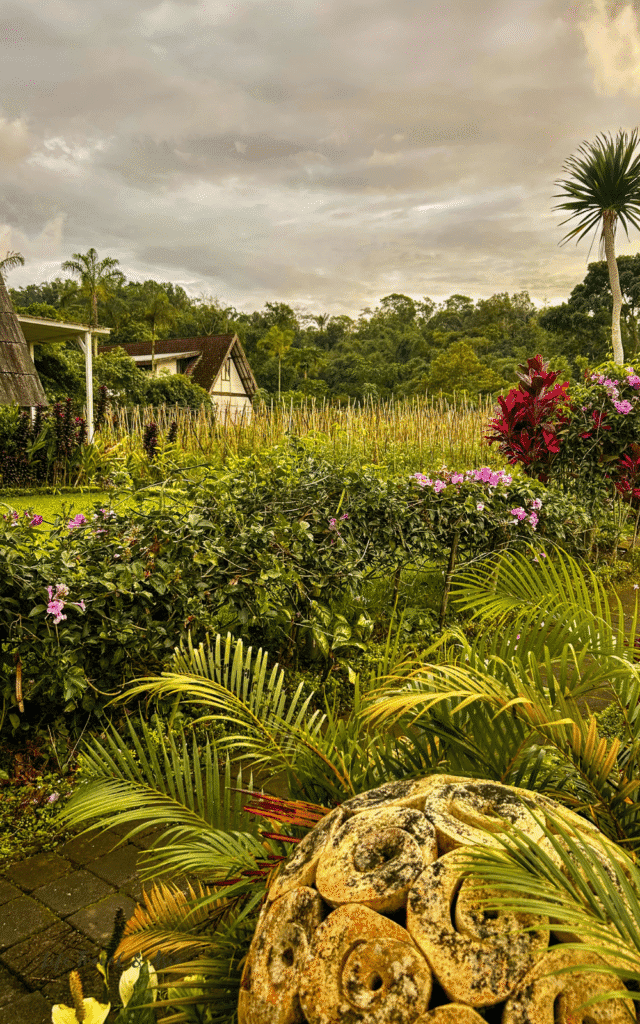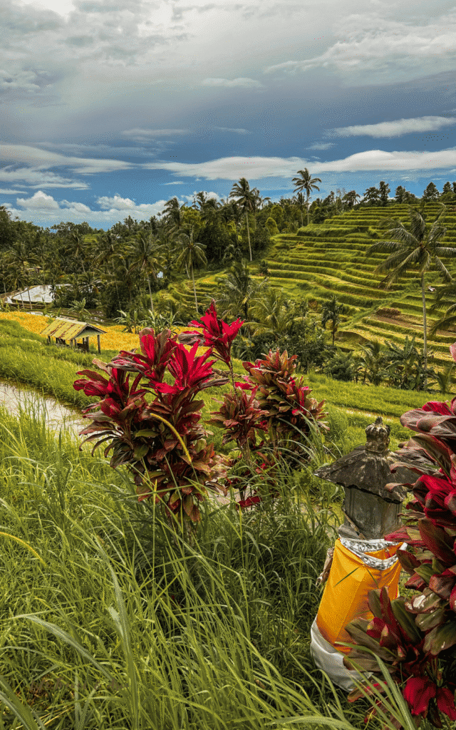 It was genuinely one of the loveliest stays I’ve had in Bali. The property is made up of bungalows with a view over the surrounding fields, set within a beautifully maintained, colorful garden.