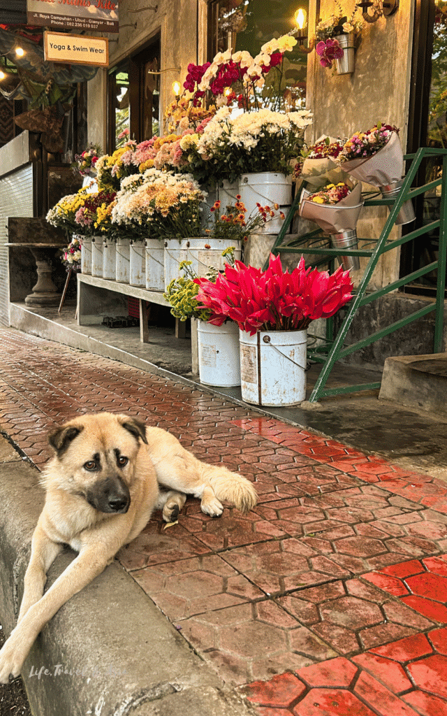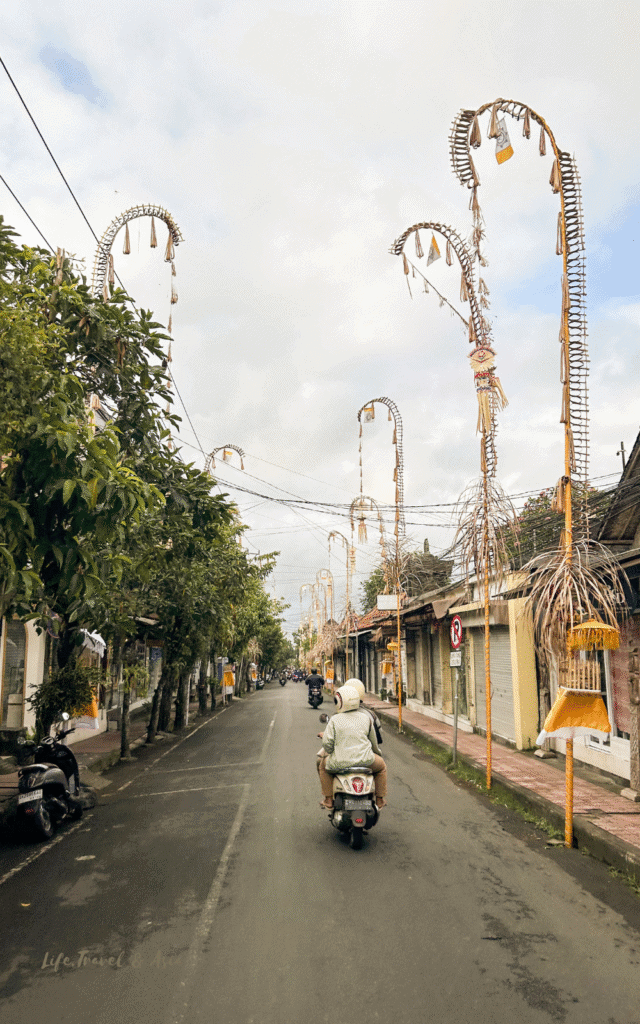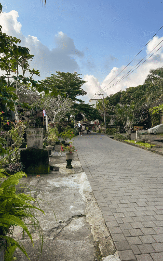 I realized how beautiful that road is — with penjor decorations, rows of red-leafed plants, and that unmistakable traditional village atmosphere right in the heart of Ubud.