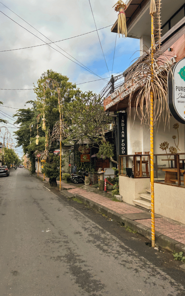 There, by turning right towards the end of the road, you’ll find what feels like a small local village — with a couple of laundries, warungs, a tiny market, some cafés, and the Penestanan Temple.