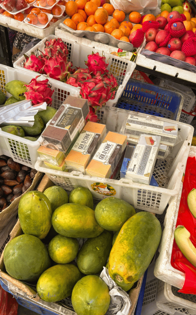 The vivid colors of dragon fruit, papayas, and limes; the scent of fresh spices, herbs, and frangipani flowers; and the cheerful voices of locals chatting with customers or among themselves all fill the air.